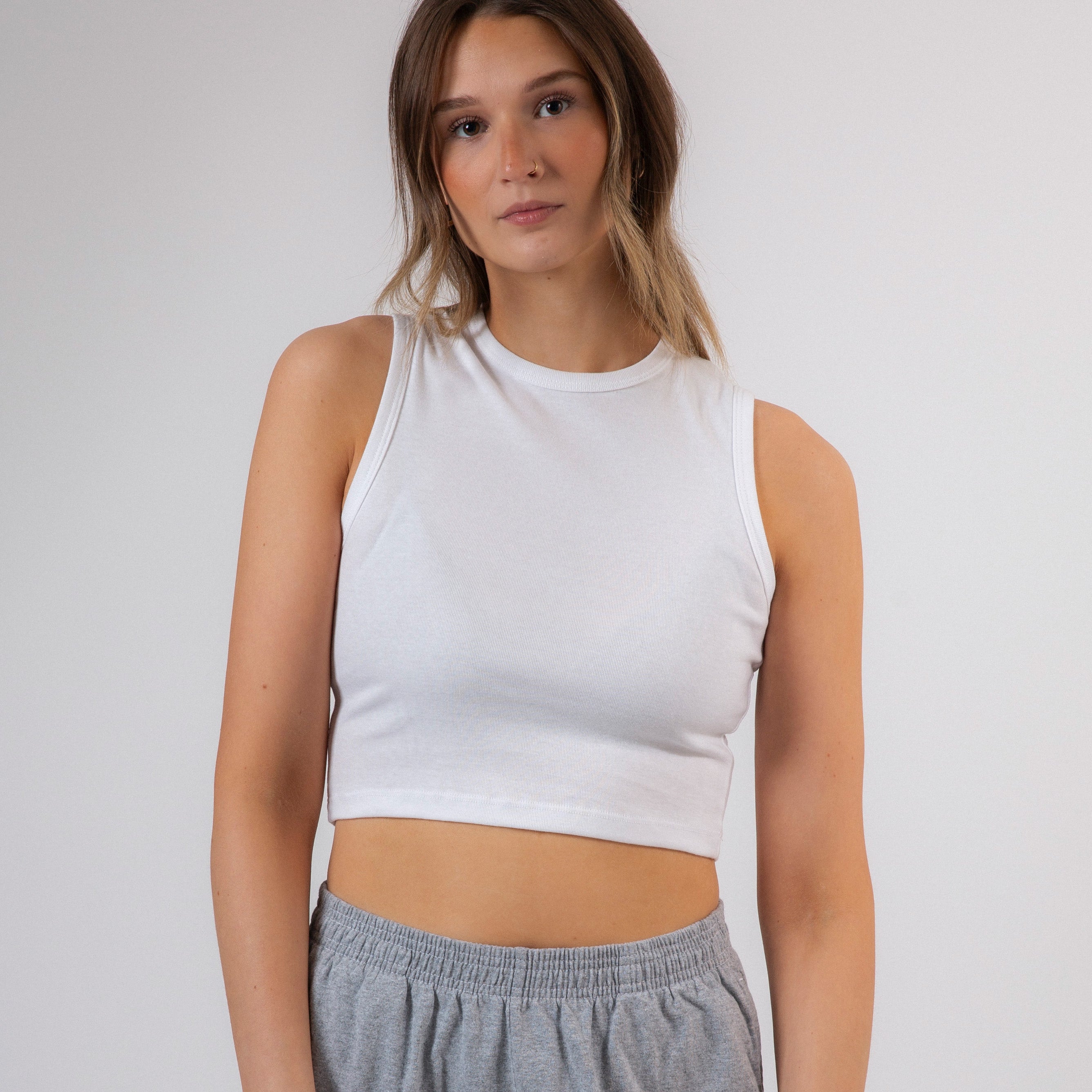 Crafted with 100% cotton and made in the USA, our Basics Baby Rib Sleeveless Crew Neck is a comfortable and durable addition to any wardrobe. With its soft fabric and quality construction, this top provides the perfect mix of style and practicality.