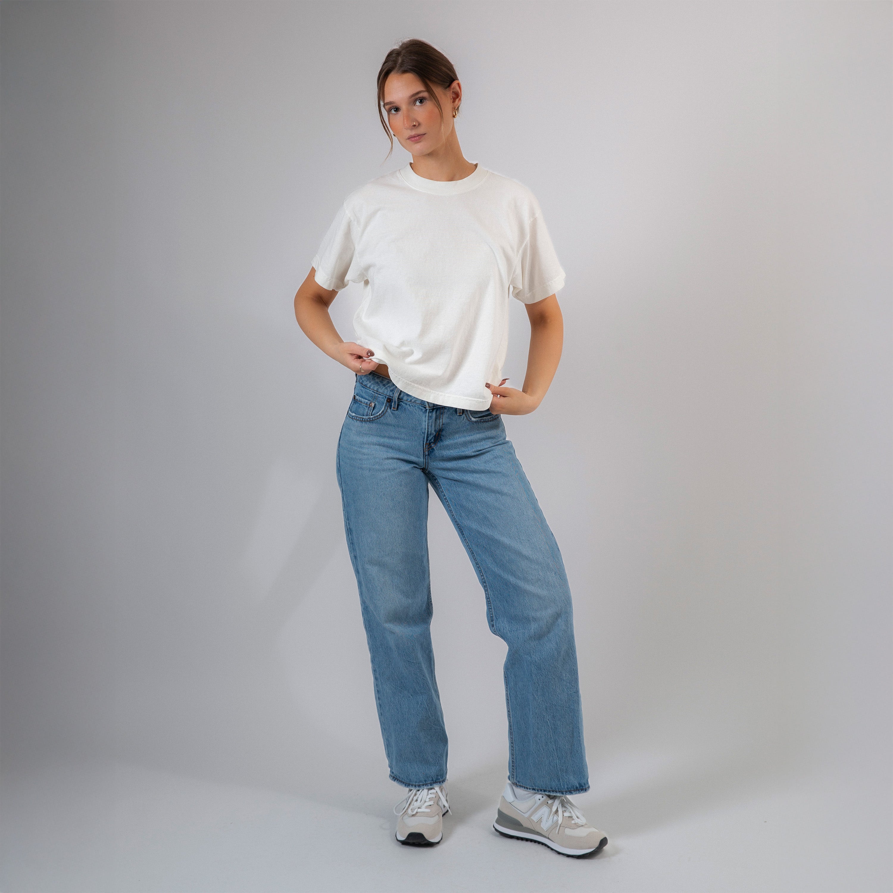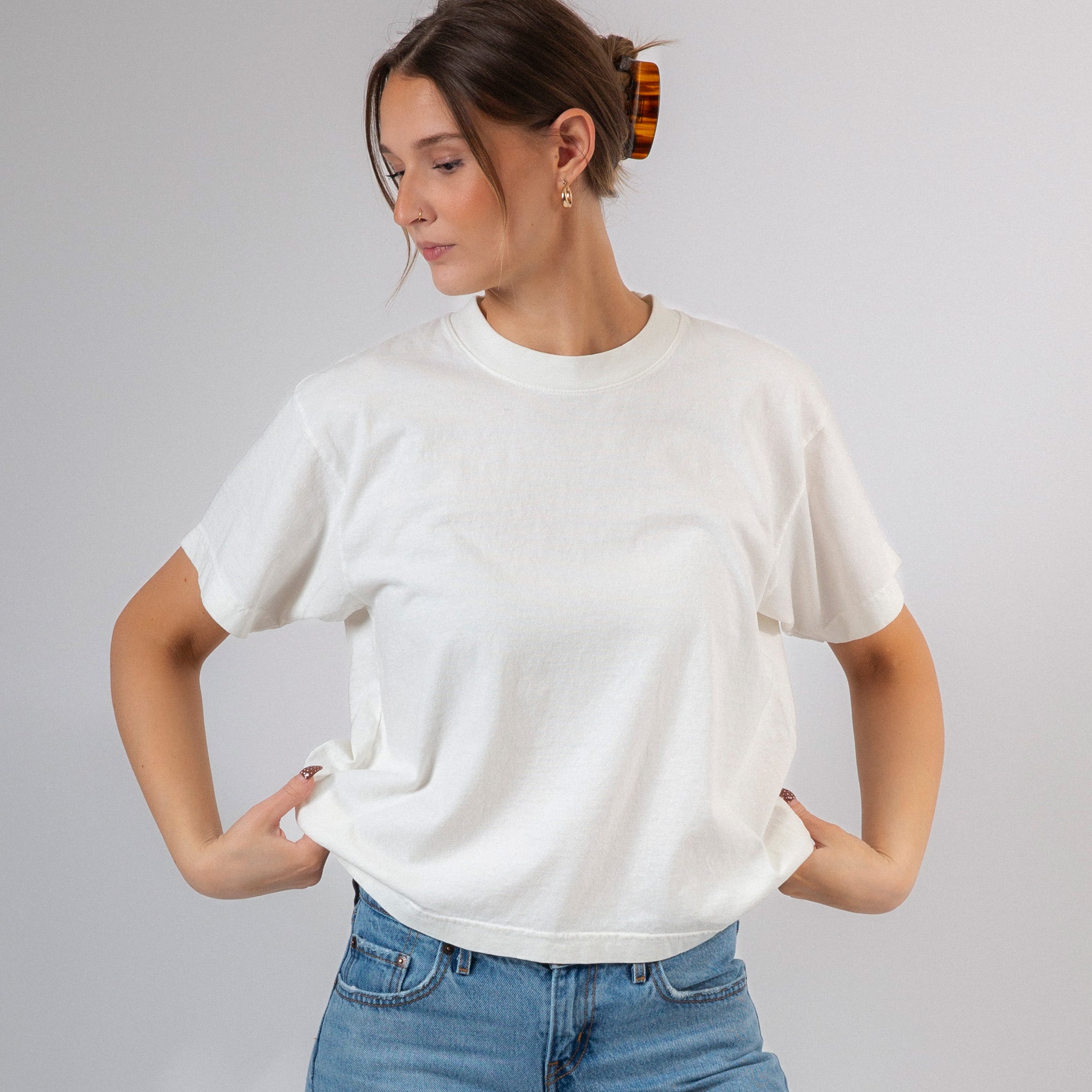 A garment dyed shirt for understated everyday looks. The Wide Tee is slightly longer than a crop tee, but wider than our standard shirts. It is slightly boxy, relaxed fit and pairs well with your favorite blue jeans.